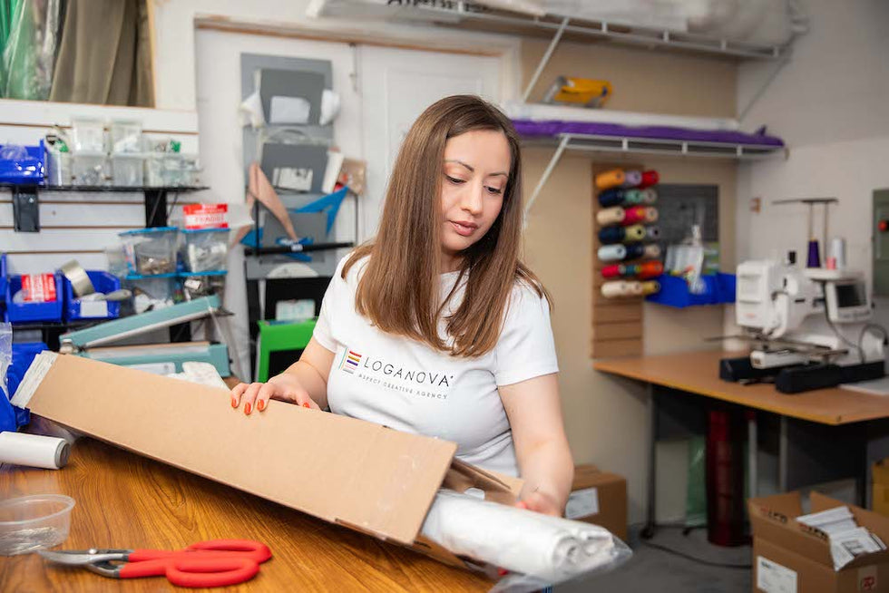 Our project manager not only oversees the creation of our Roman Shades, but she is hands-on in the final stages.